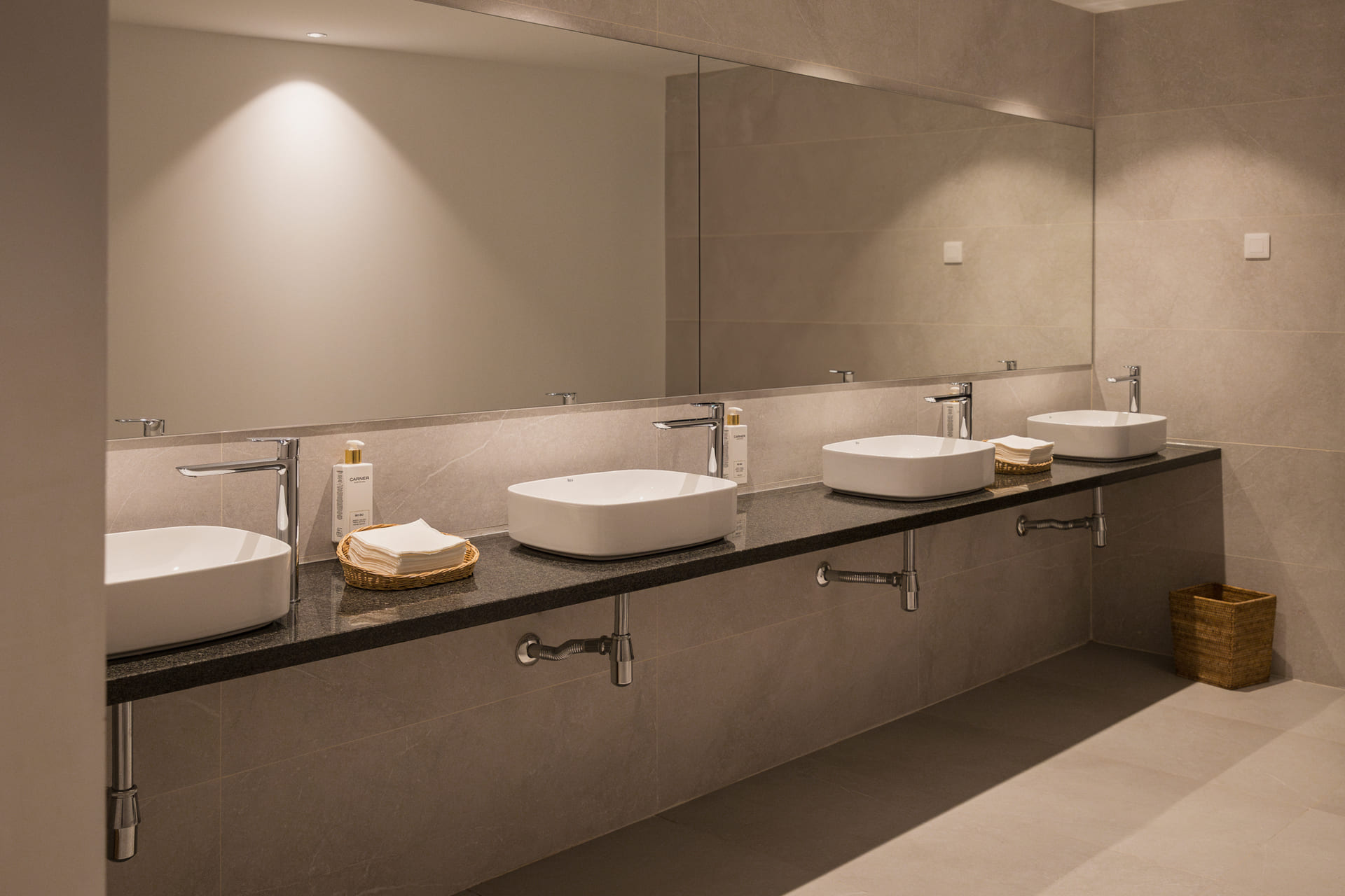 Extending this commitment to luxury and sophisticated design, the hotel's public toilets have a sleek and modern aesthetic. Featuring a long countertop with contemporary over countertop basins from the Ona collection, these spaces are both stylish and functional. The men’s area includes Mural urinals, while the women’s area features The Gap Round back-to-wall WCs.